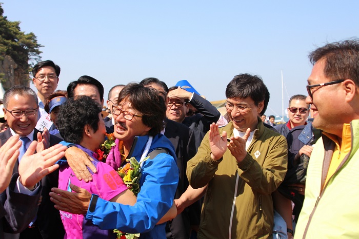 As soon as land came into sight, my eyes welled up. Saying so is quite embarrassing, as I am a man. I am very happy to return to land and to set my feet upon it. I would like to thank the people who supported me, and my daughter, mother and sister. I am happy to see them all. I am confident that the vibrant energy gathered here today will greatly contribute to the development of sailing and other marine sports here in Korea.