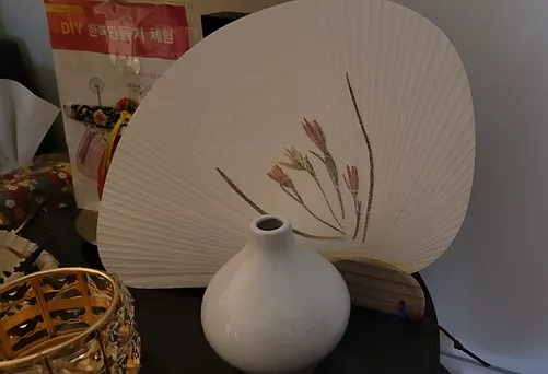For this event, they provided us with a clam-shaped Dano fan to decorate during the workshop, along with dry flowers/leaves, some glue, a tweezer and hanji paper.
