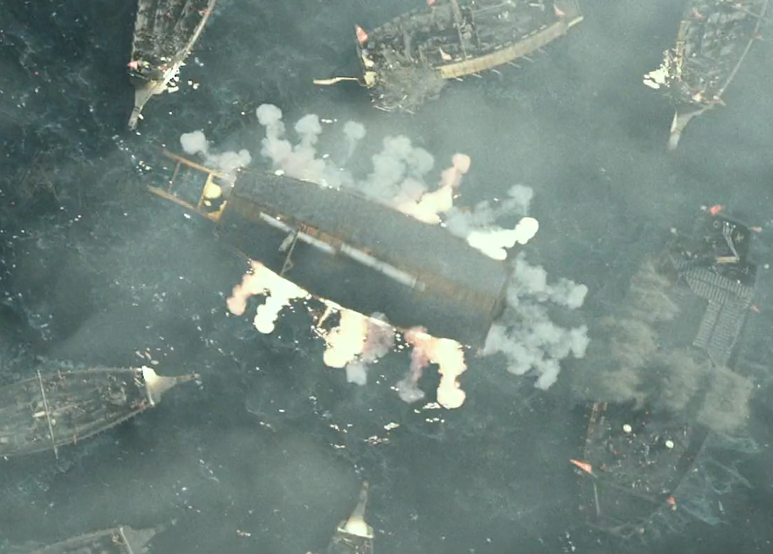 Hansan: Rising Dragon - at a critical moment, the geobukseon lures Japanese ships close and fires all cannons at once