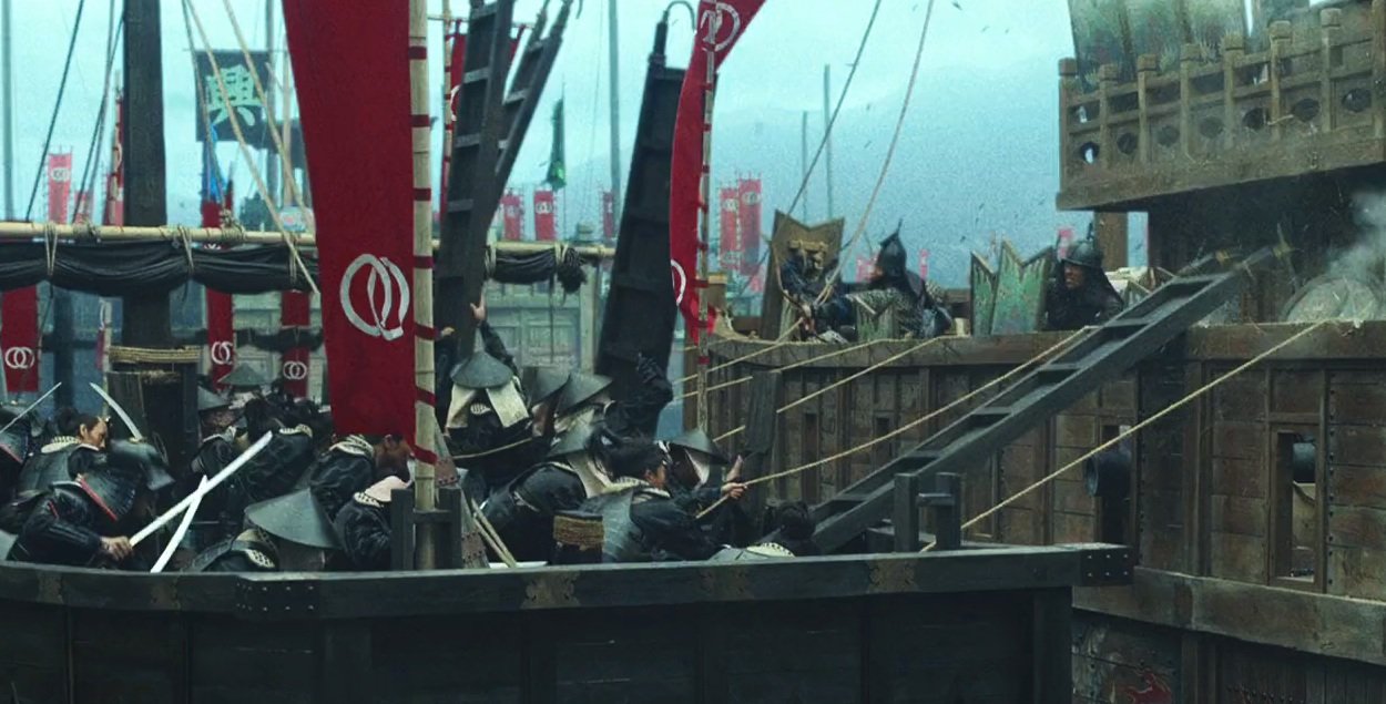 There is one other remarkable trait about the main 安宅船 leading the charge in the final battle scene, and that is its armor. Previously, in Part 1, I said it was likely that 거북선 (geobukseon) was the first armored ship in the world, and while that is true, the Japanese were also developing their own protection from cannonfire and explosives (especially since their ships were so fragile). In Hansan: Rising Dragon, when Wakisaka summons reinforcements, one of the commanders 九鬼 嘉隆 (Kuki Yoshitaka) brings with him a huge reinforced battleship covered in iron plates.