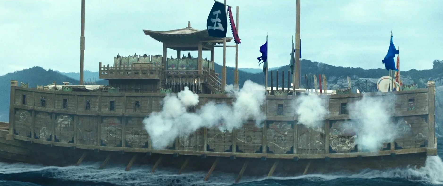 “In the film, Na Dae-yong promises the new model Turtle Ships are improved after a ram got stuck in battle. But the Admiral leaves early when he hears of Wakisaka’s incipient attack, and as an added complication, spies stole designs for the old geobukseon. Despite protest, Yi Sun-sin declares they’ll remain beached this time.”