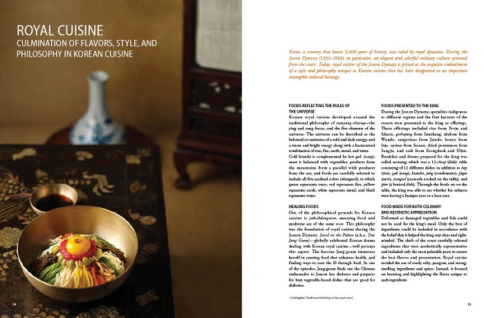 Published in English and Italian, the guidebook talks about Korea cuisine, especially about its balance between nutritional value and taste. It also provides explanations about traditional jars or vats, which many people believe store "nature," as well as, among other dishes, kimchi, one of the more prominent dishes that has represented Korean food for many years. It's interesting to read about the stories of royal cuisine that was served in the royal palaces, in contrast to the traditional foods served in homes with long family traditions, and then again with the environmentally-friendly food eaten in temples.
