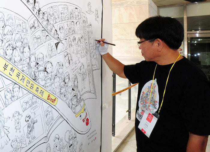 Cartoonist An Jung-geol completes one of his drawings at the Bucheon International Comics Festival.