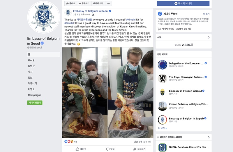 The Belgian Embassy in Seoul on Feb. 10 posted on its Facebook page images of its staff making kimchi, saying, "It was a great way to have a small teambuilding and let our newest staff members discover the tradition of Korean kimchi making."