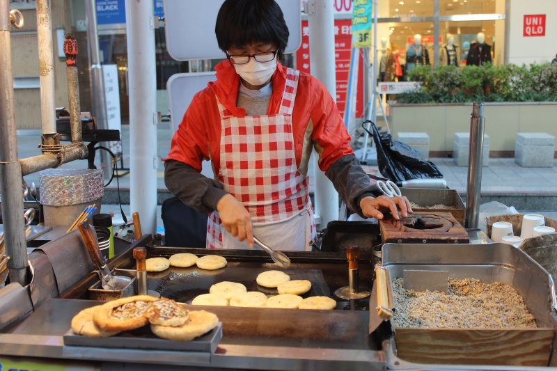 Many pojangmacha (street food kiosks) in Korea sell hotteok (sweet pancakes). (Gina Borinaga)