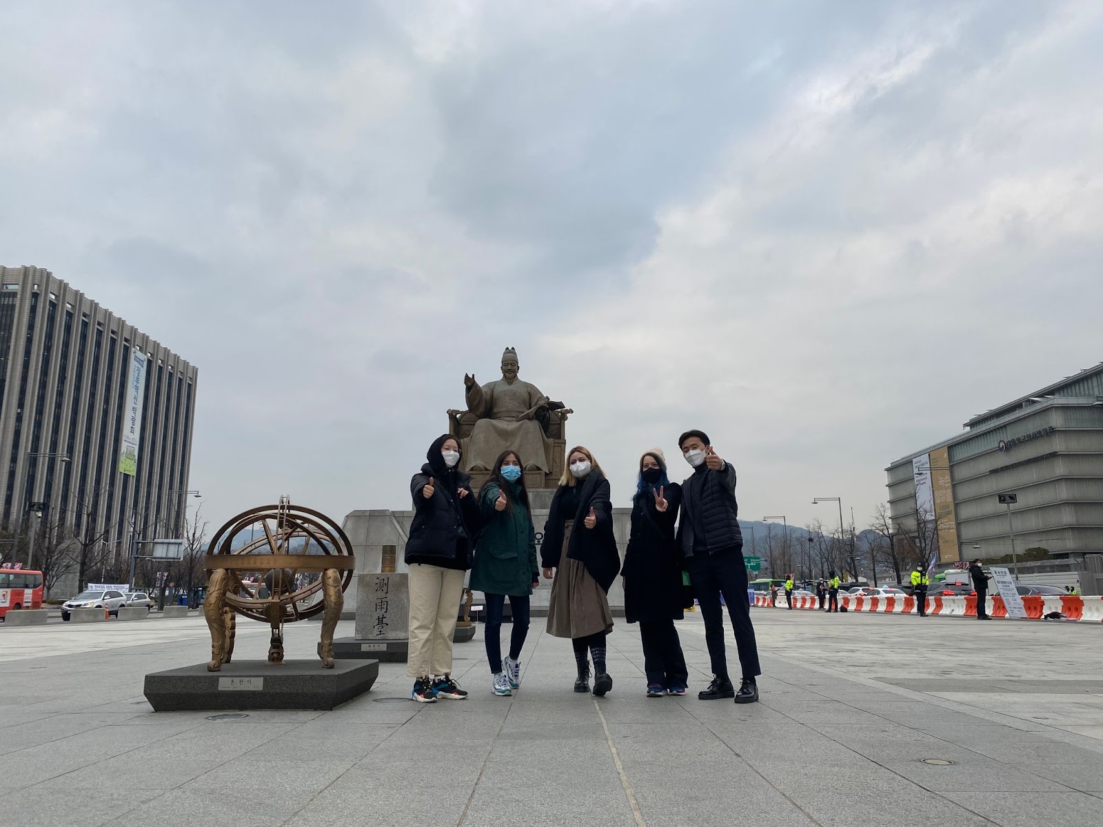 Lia Maurer poses with friends in front of the statue of King Sejong the Great at Gwanghwamun Square in downtown Seoul.