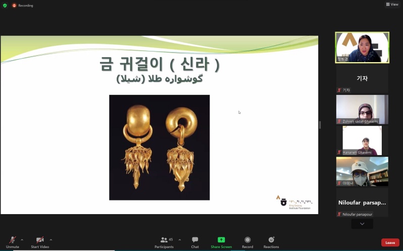 The teacher gave a briefing on the history of Korean handicrafts and showed examples and evidence of them from ancient times, displaying a pottery piece from the Silla Kingdom and antique gold earrings to show the history of the handicrafts in Korea.