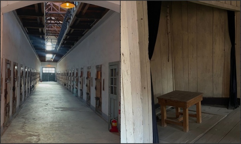 The museum shows real prison cells (left) and a trapdoor of a hanging facility used to execute prisoners (right).