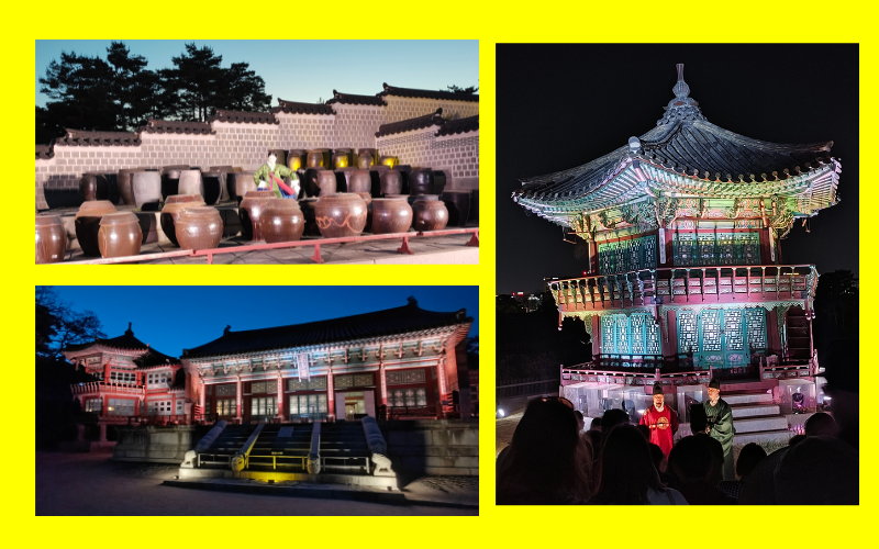 The Gyeongbokgung Starlight Night Tour covers landmarks at Gyeongbokgung Palace including the storehouse Django (top left), Jibokjae Hall and Parujeong Pavilion (bottom left), and Hyangwonjeong Pavilion (right), where actors playing the Joseon king and his servant greet guests.
