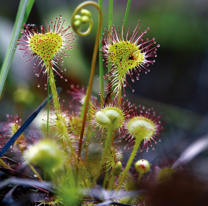 This perennial grows in sunny areas. It grows 6 to 30 centimeters tall on average. Resembling a spoon, the plant grows in clusters from the root, and is covered with red hairs with a sticky liquid substance. The leaves shrink to catch insects when the bugs touch the liquid and get stuck to the leaves. The flowers bloom at the tip of the stems, surrounded by the leaves. It has five petals. It bears capsule fruit about four to five millimeters in diameter that can be separated into three parts.