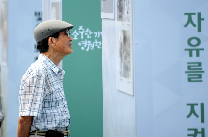 Visitors admire photographs that spotlight modern Korean history at a special exhibition in Gwanghwamun Square on Aug. 15.