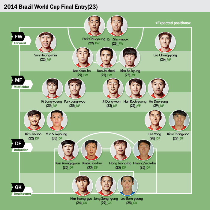 Final lineup for the Korean national soccer team for the World Cup in Brazil.
