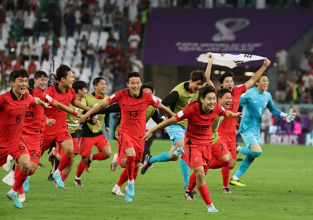 The Taegeuk Warriors on Dec. 2 run around the field in jubilation after their 2-1 upset over Portugal in their final Group H game of the FIFA World Cup at Education City Stadium in Al Rayyan, Qatar. Korea thus earned a berth in the round of 16 with its dramatic win. (Yonhap News)