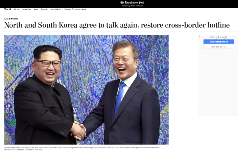 Foreign media have reported as important news the July 27 restoration of an inter-Korean communications hotline that had been severed by North Korea more than a year ago. (Screen capture from Washington Post)